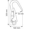 Монтажный карабин для присоединения к различным конструкциям. Размеры: 220 мм, раскрытие 53 мм. Максимальная нагрузка на главной оси: 25kN. LEVER LOCK- cистема блокировки с торцевым рычагом безопасности. Материал: оцинкованная углеродистая сталь.